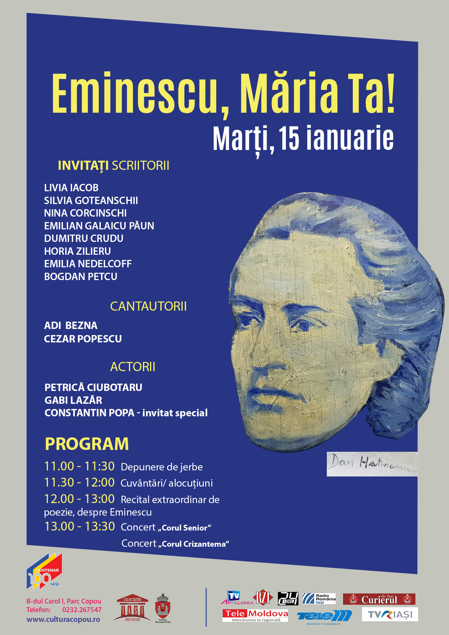 Celebrarea lui Mihai Eminescu va continua marți, 15 ianuarie, în Parcul Copou. Începând cu ora 11.00, Casa de Cultură „Mihai Ursachi” a Municipiului Iași va organiza evenimentul „Eminescu, Măria Ta!”, la care sunt așteptați să participe reprezentanții instituțiilor administrative locale, școli, universități, instituții de cultură, amintind astfel că, în aceeași zi, se serbează și Ziua Culturii Naționale.