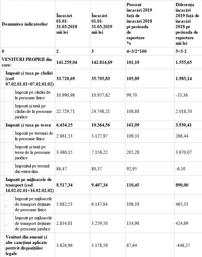Referitor la încasările realizate la principalele impozite locale de la începutul anului și până la 31 martie 2019, acestea sunt mai mari decât cele înregistrate în aceeași perioadă a anului trecut, cu excepția veniturilor din amenzi și alte sancțiuni aplicate potrivit dispozițiilor legale. Scăderea încasărilor la amenzi se observă de la momentul intrării în vigoare a Legii nr. 203 / 2018 privind măsuri de eficientizare a achitării amenzilor contravenționale. Astfel, contravenientul poate achita jumătate din minimul amenzii în termen de 15 zile, față de 48 ore cum era în vechea reglementare, iar amenzile sunt venituri ale unităților administrativ-teritoriale în care își are domiciliul contravenientul indiferent de momentul plății și nu al bugetului local unde le achită.