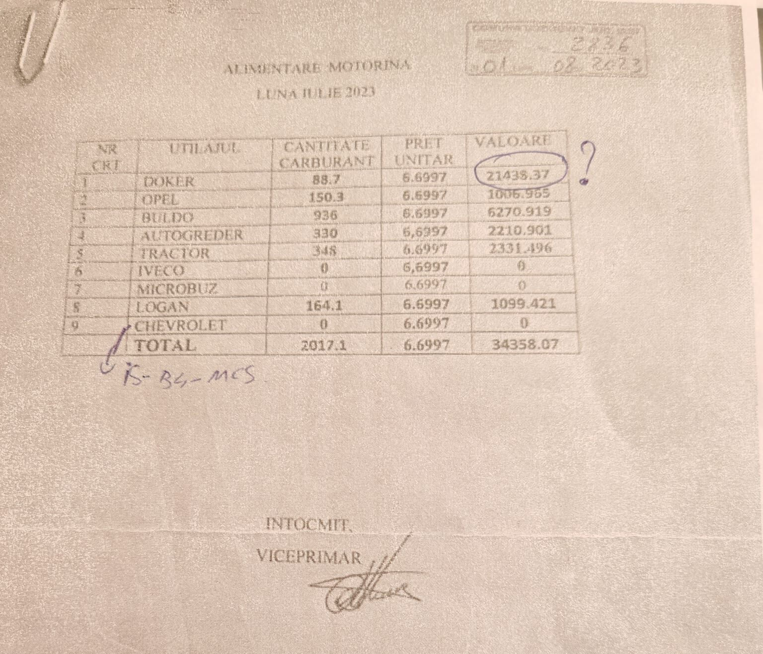 Cea mai flagrantă deturnare de bunuri publice are loc la stația de alimentare cu carburant a Primăriei. În iulie 2023, consumul a depășit 1.000 litri de motorină, o cantitate imposibil de justificat doar pentru utilajele locale.