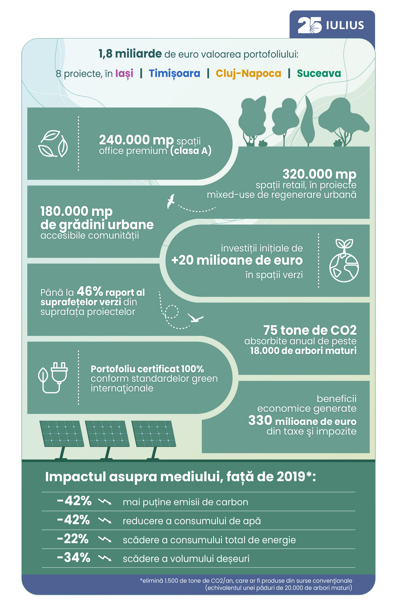„În viziunea noastră, sustenabilitatea nu se măsoară doar în indicatori tehnici, ci mai ales în felul în care proiectele contribuie la bunăstarea pe termen lung a orașelor și a locuitorilor. Iar prin intermediul grădinilor urbane – Palas Iași, Iulius Gardens Timișoara și Iulius Parc din Cluj-Napoca – am reușit să creăm legături între natură și comunitate, între spațiul construit și cel «trăit», susținând un stil de viață echilibrat și conectat la verde”, a spus Dan Adrian Chelaru, Group Sustainability Officer IULIUS.