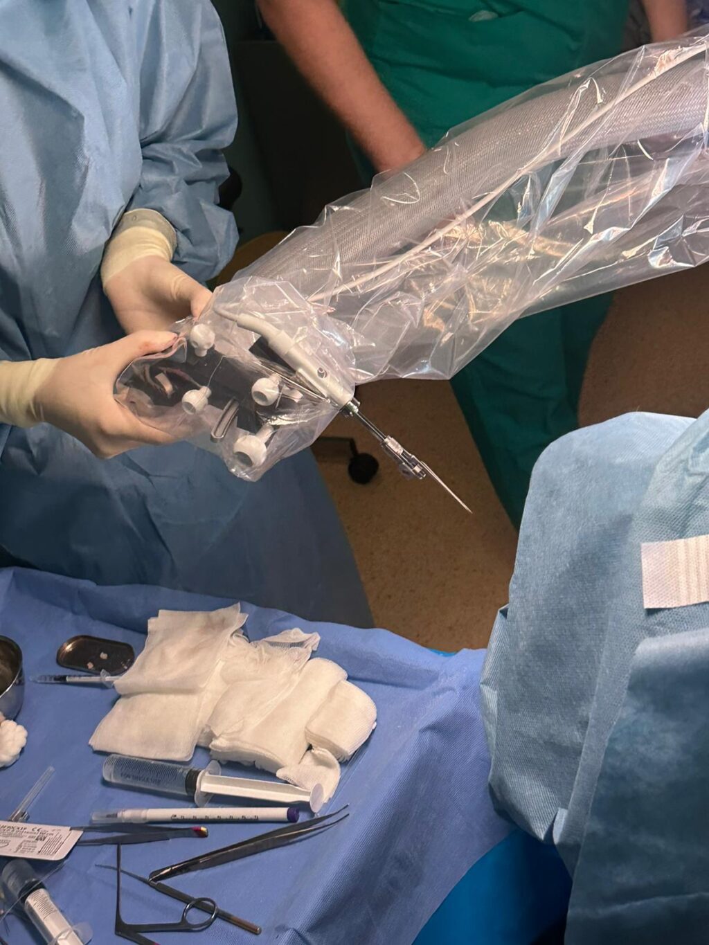 În cadrul intervenției s-a utilizat implantul Synchrony 2 (MED-EL), cu un porte-electrod Flex Standard, ales pentru caracteristicile sale atraumatice și compatibilitatea perfectă cu sistemul robotic.