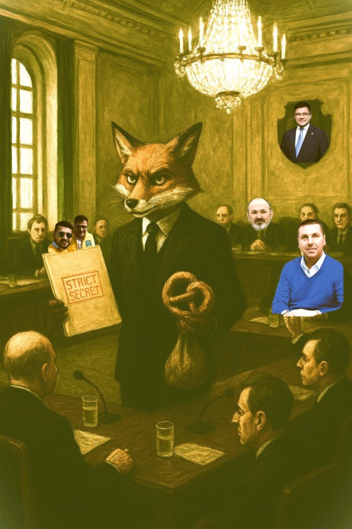 Intră Don Costelo Volpone, baron penelicesc de Tablerone și duce de Vittoria Zoo, însoțit de doi aghiotanți neangajați, dar fideli moral. În mâna dreaptă ține un dosar cu ștampila „STRICT SECRET” și în stânga o pungă cu doi covrigi.