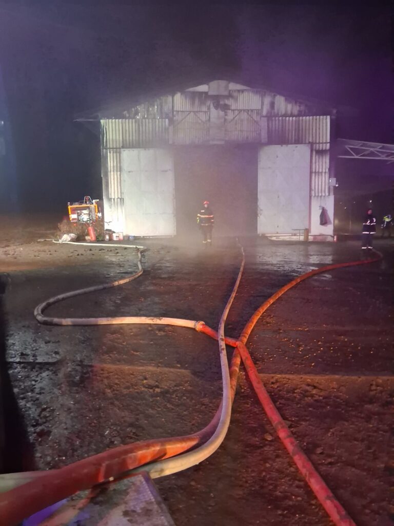 Pompierii lucrează pentru a limita extinderea incendiului la structurile și bunurile din apropiere, precum și pentru protejarea utilajelor agricole rămase în interiorul halei.