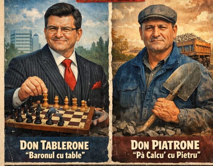 Don Piatrone nu joacă șah. El joacă țurca cu realitatea. Nu mută piese, mută materiale. Nu face strategii, face platforme. Și când cetățeanul întreabă unde-s drumurile, primește răspuns festiv: luminițe, brad, poate și-un Moș care dansează, căci, nu-i așa, dacă tot te împotmolești în noroi, măcar s-o faci în spirit de sărbătoare.