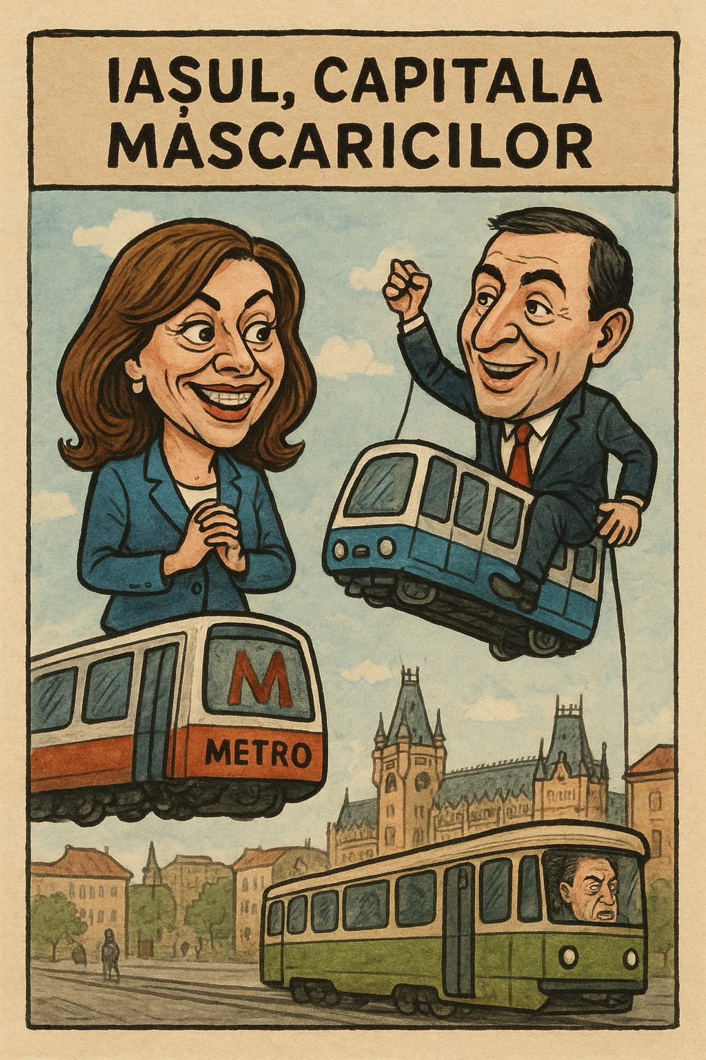 Iașul are doi campioni la farsa politică: Cozet și Urțoi. Ea, specialistă în răzgândeli spectaculoase și metrou imaginar, el, expert în trenuri suspendate care sfidează gravitația… și logica. Sunt doi mascarici, dar cu vrajeli de doi lei au reușit să ajungă sus: ea în Parlament, el în vreun minister de nimeni știe ce.