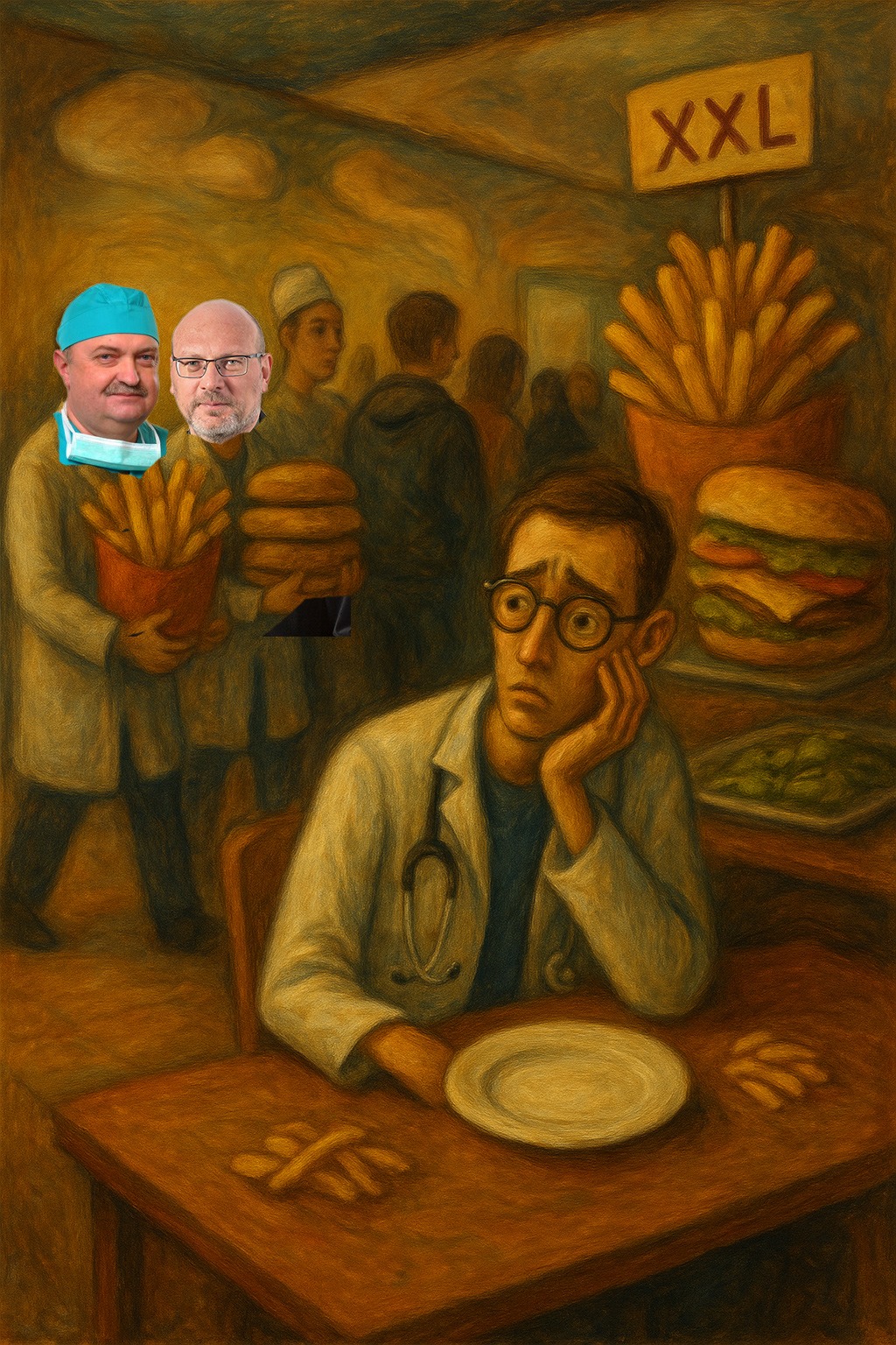 Și atunci am pășit în cantina universității – acea „fortăreață gastronomică” unde, aparent, legile fizicii nu se aplică. Acolo, medicii și asistenții, înarmați cu pungi gigantice și pachete XXL, fac jafuri alimentare care ar merita un documentar Netflix. În timp ce eu, muritor de rând, îmi calc burta goală cu ochii, ei se aprovizionează pentru… probabil, o pandemie globală sau un apocalips zombie.