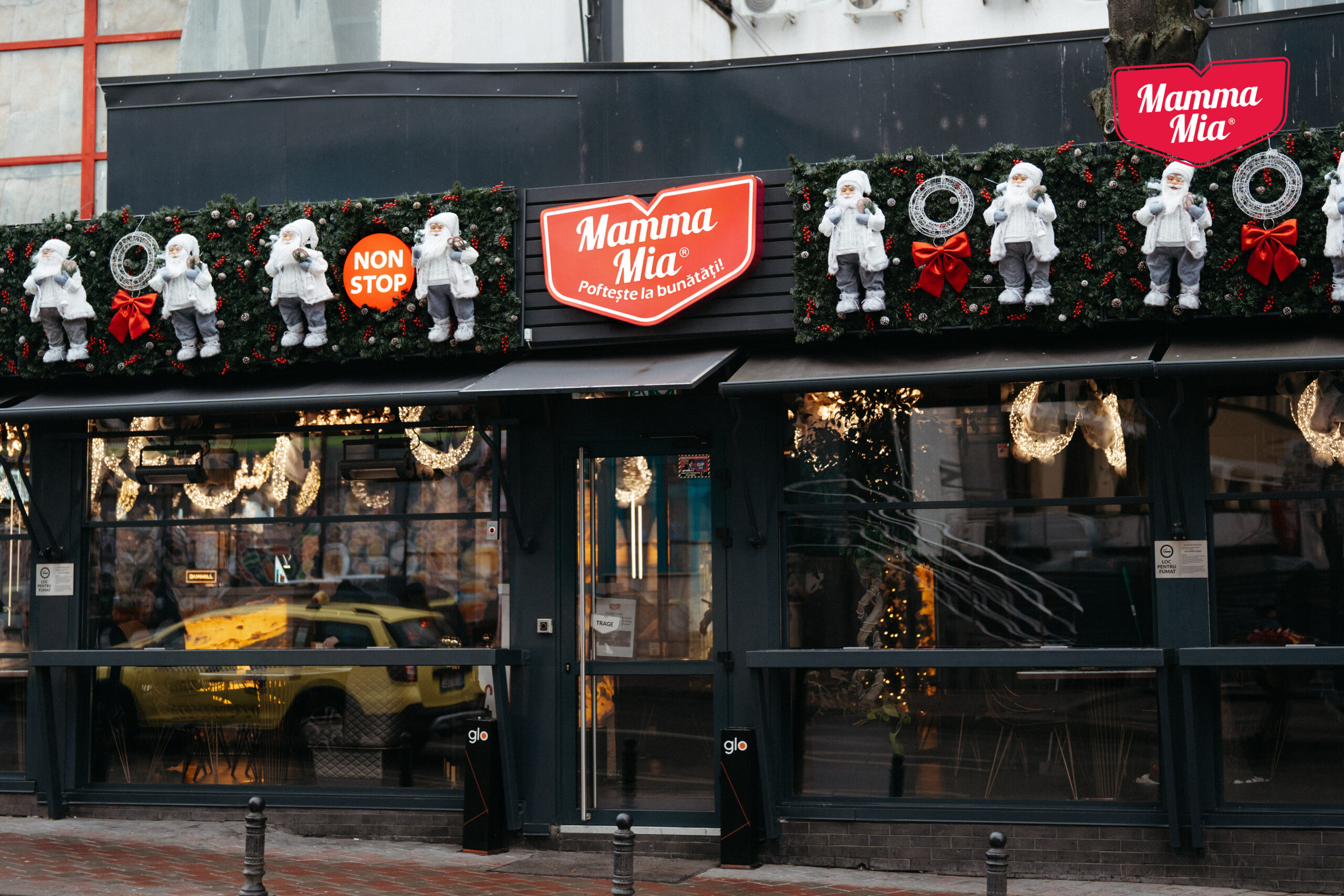 Plimbându-te prin centrul vibrant al Iașului, vei descoperi fațadele Mamma Mia strălucind sub lumini calde, decorate cu spiriduși jucăuși și ornamente festive care atrag privirile tuturor.