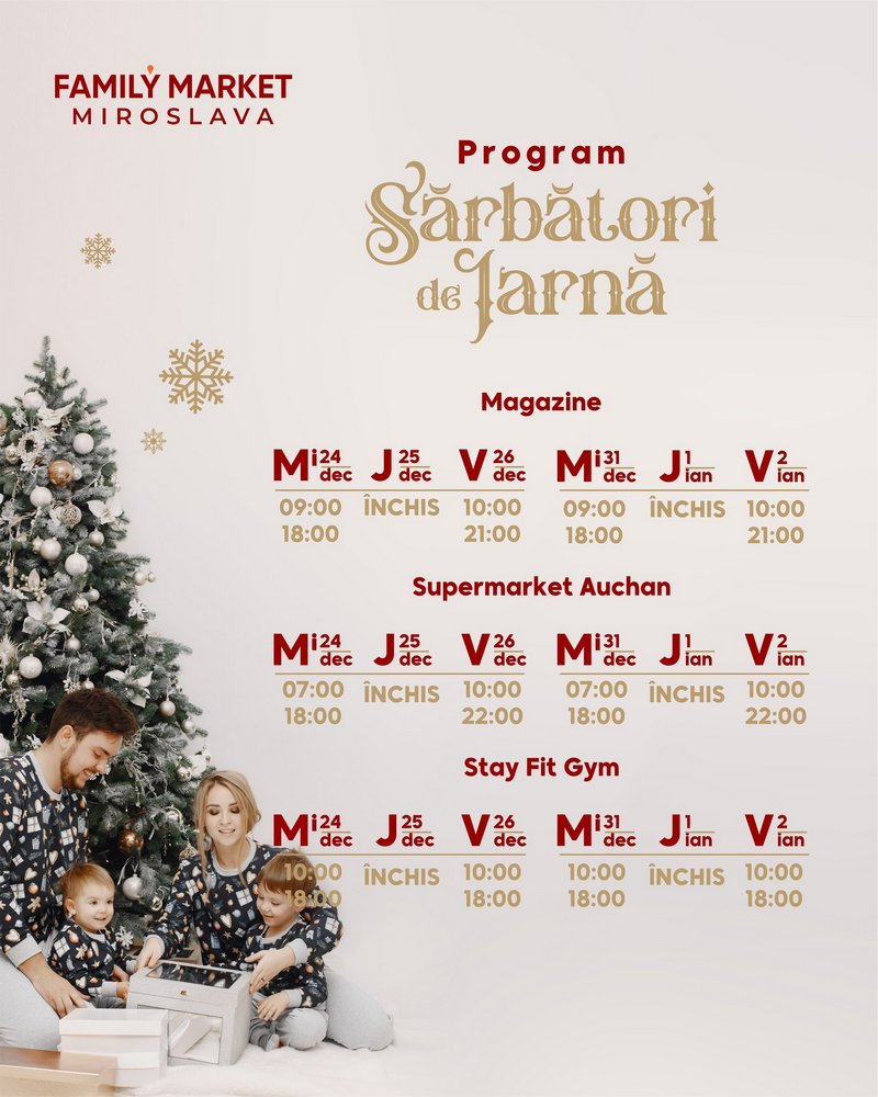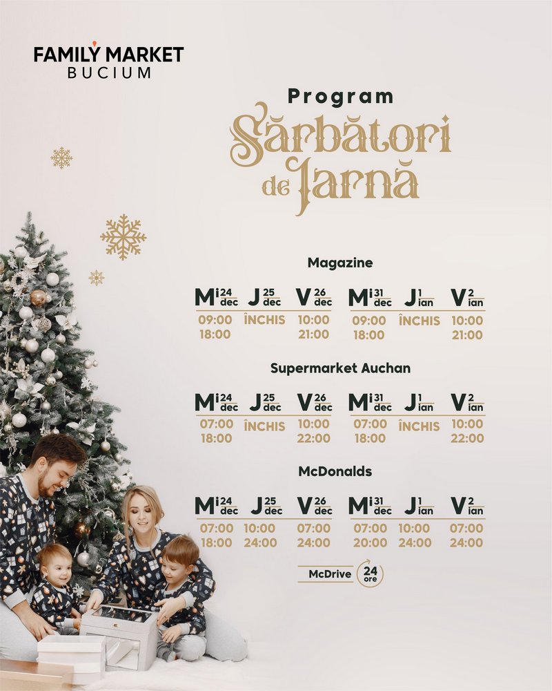 Și proiectele Family Market din Bucium și Miroslava vor funcționa după un program special de sărbători. Pe 24 decembrie și 31 decembrie, vei putea face ultimele cumpărături în intervalul 09.00 – 18.00. În prima zi de Crăciun și pe 1 ianuarie, magazinele vor fi închise, iar din a doua zi magazinele se vor deschide de la ora 10.00. Același program îl va avea și sala de fitness Stay Fit Gym din Family Market Miroslava. La Family Market Bucium, McDrive-ul va fi deschis non-stop.