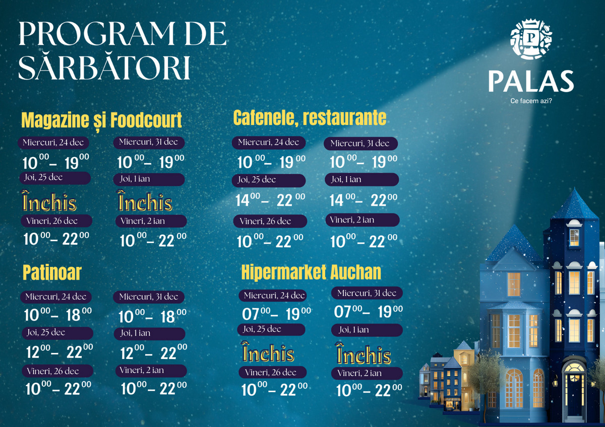 Palas va funcționa după un program special. Astfel, pe 24 și 31 decembrie, magazinele vor fi deschise în intervalul orar 10.00 – 19.00, iar hipermarketul Auchan va funcționa între orele 07.00 și 19.00. În prima zi de Crăciun și pe 1 ianuarie 2026, magazinele vor fi închise, urmând ca din 26 decembrie, respectiv 2 ianuarie, programul să revină la normal. Dacă dorești să ieși cu cei dragi în prima zi de Crăciun sau pe 1 ianuarie, trebuie să știi că patinoarul va fi deschis între orele 12.00 și 22.00. După o sesiune de distracție pe gheață, vă puteți relaxa la unul dintre restaurantele din Palas, deschise în intervalul 14.00 – 22.00. Programul complet poate fi consultat pe Facebook-ul Palas Iasi.