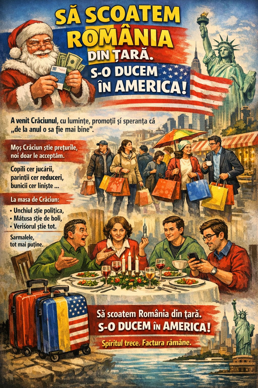 Și totuși, pentru câteva ore, suntem mai buni, mai îngăduitori și mai dispuși să credem că România n-ar trebui reparată, ci mutată. Așadar, să scoatem România din țară. S-o ducem în America! Sau măcar să mai stăm un Crăciun împreună și să ne prefacem că merge.