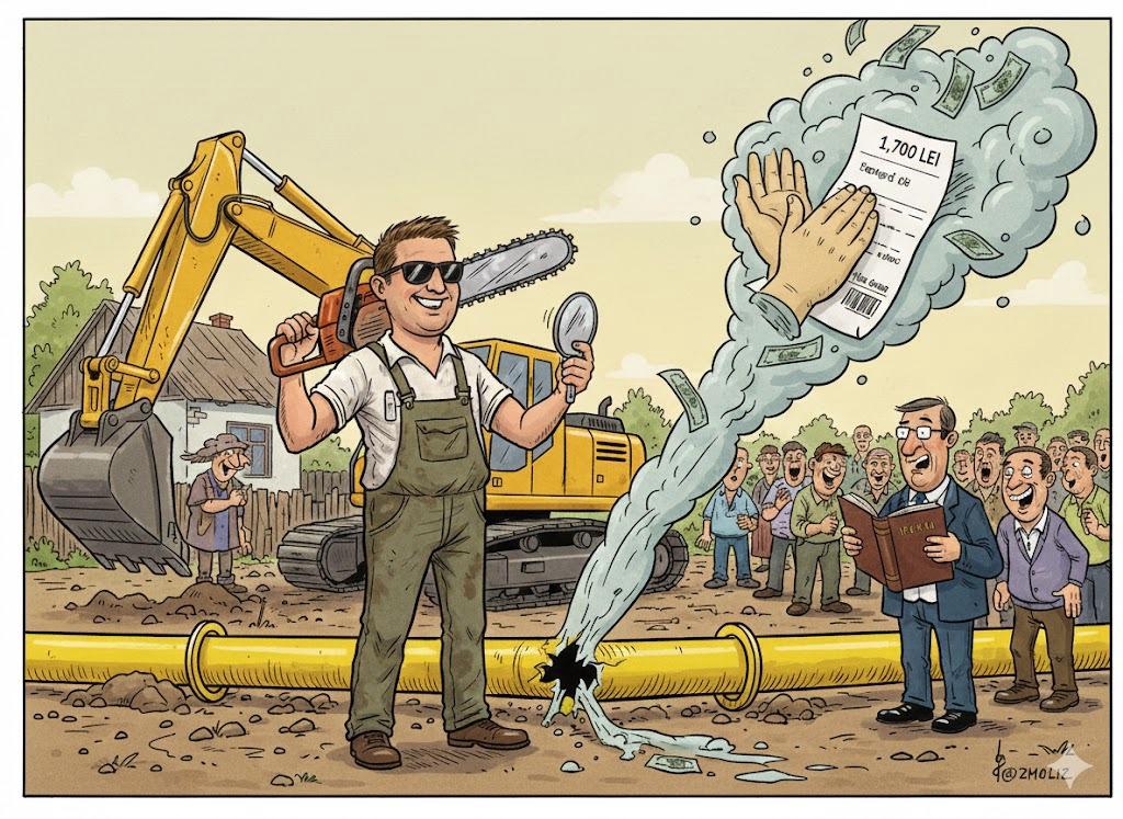 „Păi gazul nu e chiar gaz, e provocare!”, spune Costicâ, privind cum șuierul se răspândește ca aplauzele la un festival de comedie rurală. O factură de 1.700 de lei? Nimic pentru un Mirlete adevărat! El ridică drujba ca pe un sceptru și proclamă: „Dacă țeava e ruptă, e doar ca să vă arăt eu cât de mare sunt!” Gazul se răsucește, explodează în șuierături, iar Dorel-Chelarul se oprește doar pentru a-și verifica coafura, căci mărirea trebuie afișată impecabil.