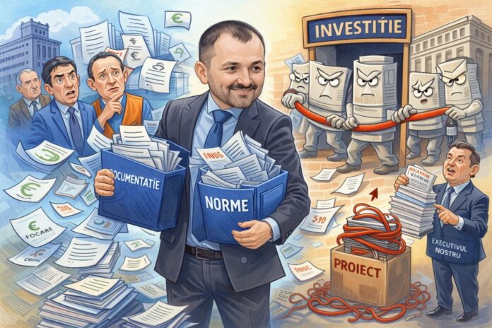 CJ-ul împrumută, DJADP-ul așteaptă, investiția stă la ușă, dar… hop! Normele! Așa că Măriusică, cu un aer grav și o frază de trei rânduri, mută documentația dintr-o mapă în alta, dintr-o instituție într-alta, într-un dans birocratic demn de Balșoi Teatr Administrativ.