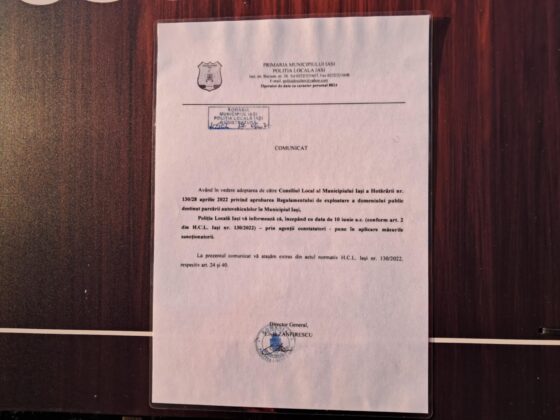 “Având în vedere adoptarea de către Consiliul Localal Municipiului Iași a Hotărârii nr. 130/28 aprilie 2022 privind aprobarea regulamentului de exploatarea domeniului public destinat parcării autovehiculelor în Municipiul Iași. Poliția Locală vă informează că, începând cu data de 10 iunie a.c., prin agenții constatatori, pune în aplicare măsurile sancționatorii”, se arată în “comunicatul” lipit de panoulul lui Bălteanu, sub semnătura lui Liviu Zanfirescu, omul care prin defectuosul management al Poliției Locale, prejudiciază zilnic interesul ieșenilor.