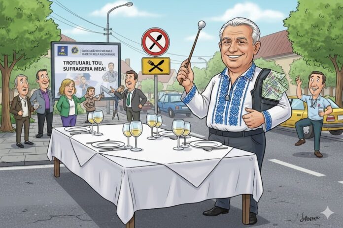 Zbang! Poc! Crac! Strada Nicu Gane se trezește într-o dimineață și… hopa! – trotuarele dispar ca prin magie, transformate în parcare personală pentru Nea Bălti, Colonelu’ PNL, Sau E T Bălteanu, pe porecla sa din civilie, omul cu portofel cât o bibliotecă și carnet de partid mai gros decât agenda Primăriei! Pietonii? Legea? Hehe… legea-i ca vântul: bate unde vrea, dar nu unde stă colonelul. Popici cresc, semne apar, trotuare se evaporă, iar pietonii se uită și spun: „Doamne, dar asta e strada mea sau anexă la restaurantul de lux cu farfurii care se plimbă singure?” Farfurii, pahare, pahare și iar farfurii – totul în numele confortului personal și al eleganței selective.