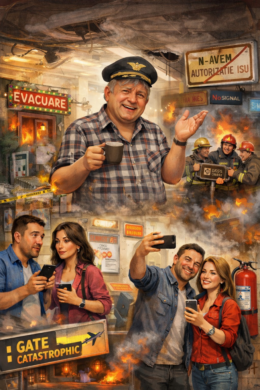 La Aeroportul Muncipal, Nea Romicâ, managerul nostru epic și guru al siguranței imaginare, ne liniștește cu vorbe de aur: „Pasagerii sunt complet în siguranță, avem sisteme moderne de stingere și detecție!”. Autorizație ISU? Ce-i aia? Noi avem pompieri cu autospeciale care apar în două minute… dacă le pui o hartă GPS în față și le spui „go!”. În realitate, terminalul strălucește ca un cristal… de plastic, iar pancartele „Evacuare” par mai degrabă niște decorațiuni de Crăciun. Dar să nu ne panicăm: Romicâ ne asigură că totul e OK. Fiecare pasager poate să citească instrucțiunile de incendiu pe telefon… dacă bateria ține și Wi-Fi-ul funcționează.