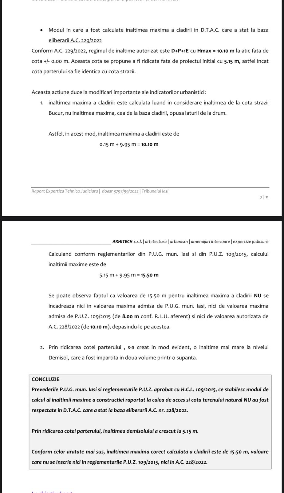 O expertiză tehnică judiciară a confirmat că prevederile PUG Iași și PUZ aprobat cu HCL 109/2015, care stabilesc modul corect de calcul al înălțimii maxime a construcției raportată la calea de acces și cota terenului natural, nu au fost respectate pentru autorizația nr. 228/2022.