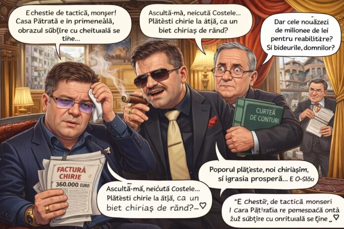 — „Pardon, onorabile! Dar cele nouăzeci de milioane de lei pentru reabilitare? S-a făcut hârțogăraia și… s-a abandonat din mers? Curat constituțional, n-am ce zice! Și bideurile, domnilor? O sută de mii de lei la firma cu pedigri leberalicesc pentru niște bude la Casa Pătrată, fix înainte să plecați în chirie?”