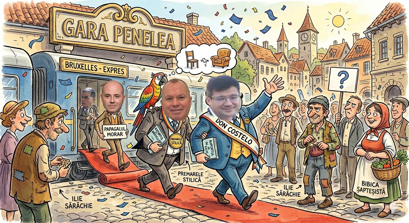 Onorabile cititor, distinși bibici și bibice șaptestiști, mare zarvă la întoarcerea delegației! Gara – plină, lumea – curioasă, iar ai noștri bravi patrioți, în frunte cu Don Costelo și premarele Stilicâ, coboară din tren cu aerul acela grav, de parcă ar fi mutat hotarele Europei cu pixul.