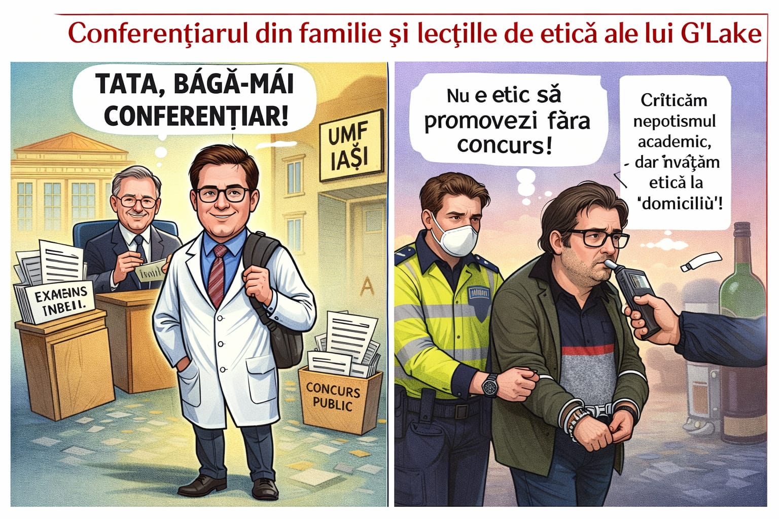 Dar iată, bibicilor, că unii moftangii vin și încep să critice – vezi tu, sunt unii care își permit să vorbească despre nepotisme academice. Unul dintre ei, un cunoscut personaj de prin presă, G’Lake, ne spune cum că nu e etic să promovezi așa, fără concurs. Ei, bine, dragă mangafale moraliști, uite ce să zicem: dacă îți permiți să dai lecții de etică, dar ești prins băut la volan, poate ar fi bine să stai un pic pe margine și să-ți faci autocritica, nu? Pentru că, nu-i așa, stimabile, lecțiile de etică vin mult mai bine când nu le înveți pe cont propriu în fața unui alcooltest.