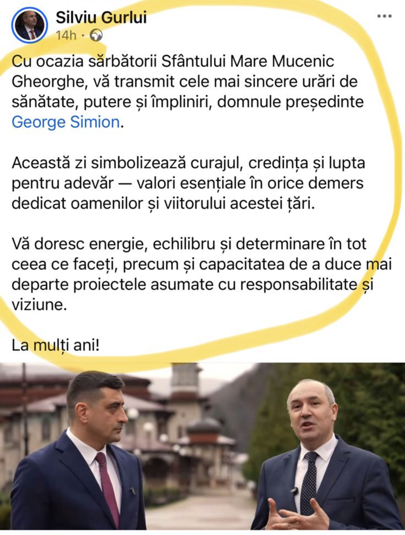 Un episod care a atras atenția a fost mesajul public transmis către liderul partidului, George Simion, cu ocazia onomasticii. Un text plin de formule solemne despre „curaj”, „credință” și „lupta pentru adevăr”.