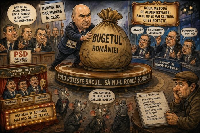„Bolo rotește sacul… să nu-l roadă șoarecii!” — iată formula care a făcut carieră în cancelarii, bufete și studiouri de analiză, unde fiecare expert o interpretează altfel, dar toți sunt de acord că sună îngrijorător de eficient. Căci în politikia noastră dâmbovițană, rotația nu e doar un procedeu mecanic, ci un întreg sistem filosofic: dacă nu mai știi ce e în sac, îl învârți. Dacă nu mai ies cifrele, le rearanjezi. Dacă apar întrebări, se face o comisie de rotație a răspunsurilor.