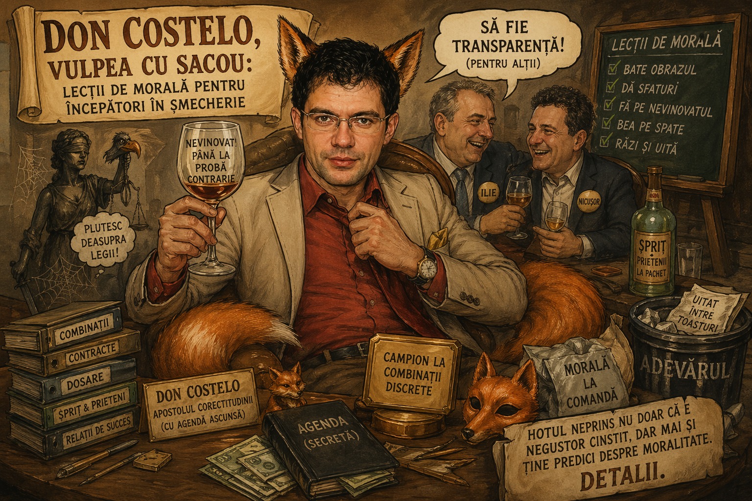 Într-o lume în care obrazul gros ține loc de CV, iar combinația e sport național, răsare, stimabile, dintre dosare prăfuite și pahare de șpriț un personaj de poveste: Don Costelo, vulpea moralistă cu blană lucioasă sub sacou și conștiință elastică. Judecat, dar neatins de vreo condamnare, Costelo plutește deasupra legii precum un pescăruș deasupra gropii de gunoi – atent, calculat și mereu cu ciocul pregătit.