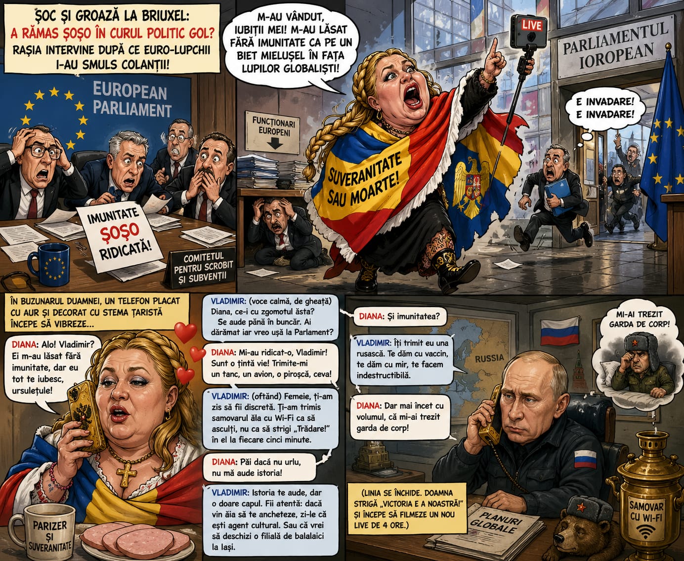 Se făcuse mare vânzoleală în muncipiul de la Briuxel, stimabile, unde domnii deputați, cu gulerul scrobit și mintea la subvenții, s-au pus la sfat. Motivul? Duamna Șoșo, această Mis Pighi variantă locală, cu voce de sirenă antiaeriană, rămăsese fără faimosul scut de imunitate. Cică o caută niște domni cu dosare sub braț pentru o groază de chestii: ba că se joacă cu focul la Răsărit, ba că tulbură liniștea publică prin urlete ce sparg și geamurile termopan ale Parliamentului Ioropean.