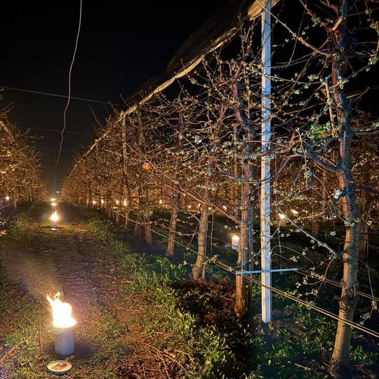 Cele 4.000 de lumânări au ridicat temperatura din livadă cu câteva grade, suficient pentru a proteja florile fragile de îngheț.