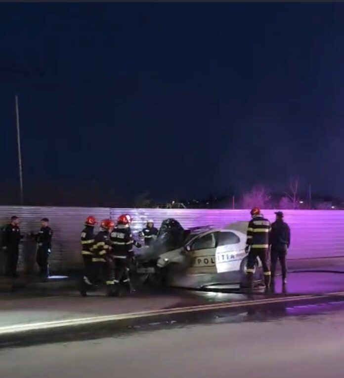 VIDEO O autospecială de poliție a luat foc în mers în Bucium